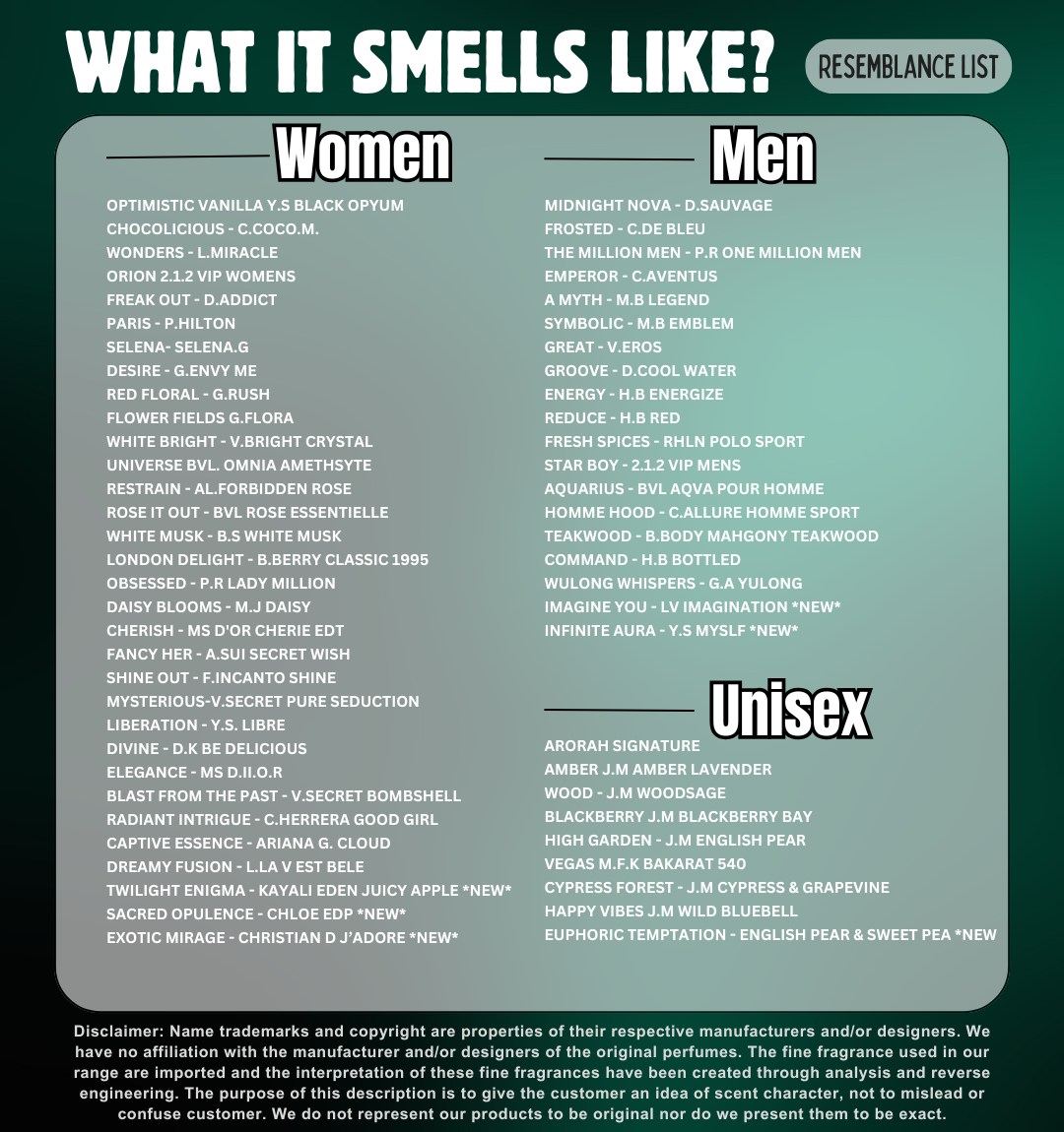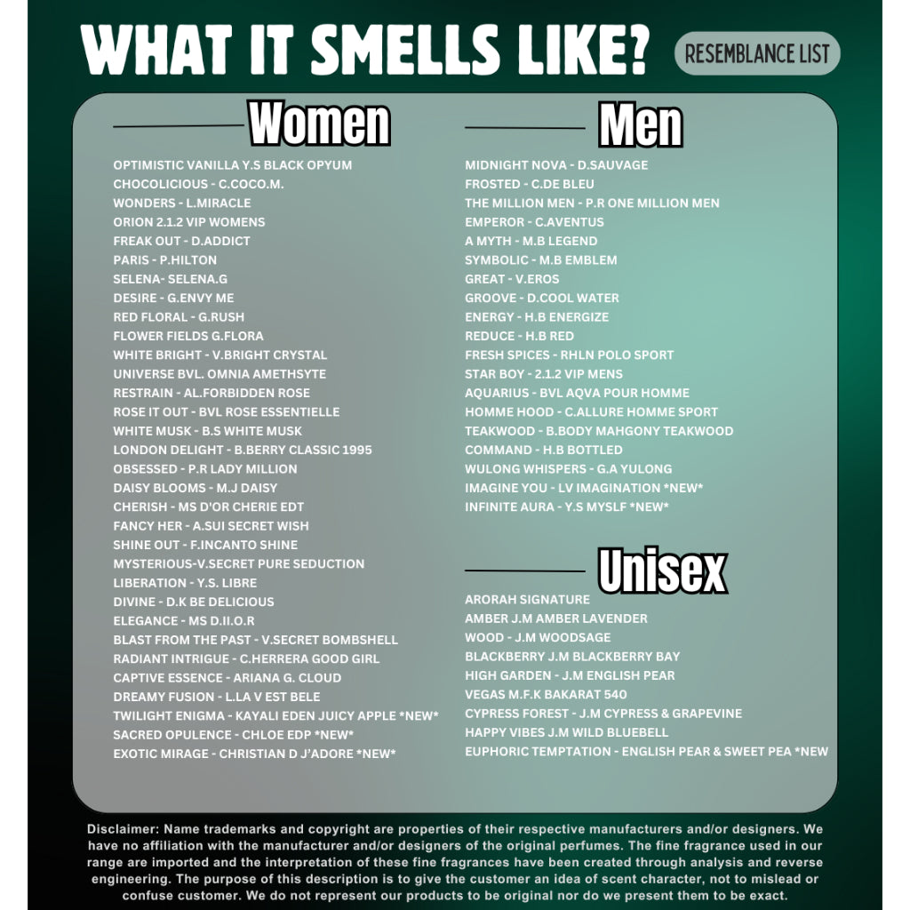 **Disclaimer: Name trademarks and copyrights are properties of their respective manufacturers and/or designers. We have no affiliation with the manufacturer and/or designer of the original perfumes. The fine fragrance used in our range are imported and the interpretation of these fine fragrances have been created through analysis and reverse engineering. The purpose of this description is to give the customers an idea of scent character, not to mislead or confuse the customer. We do not represent our products to be original nor do we represent them to be exact.